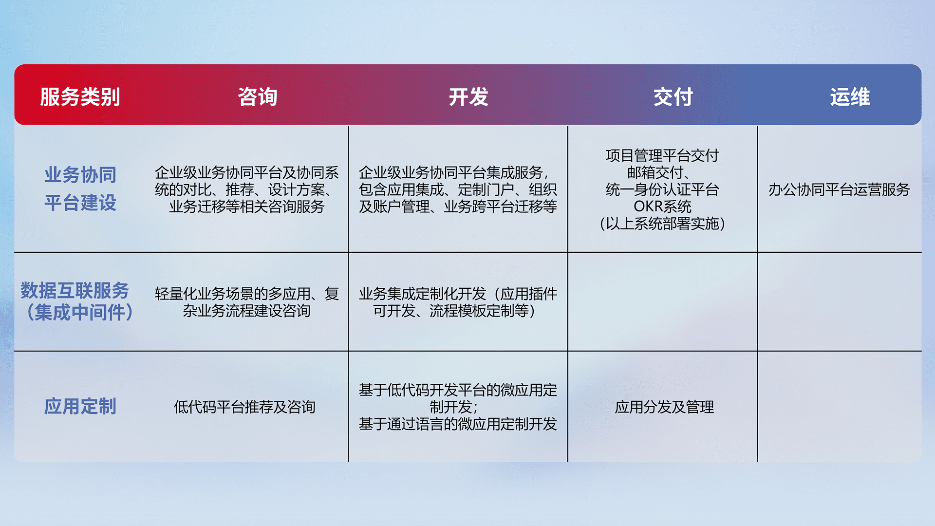 针对钉钉、、、企微、、、、IDaas等平台级产品提供产品的规划、、、、方案、、、、交付、、定制化开发等服务,,实现如统一协同办公、、、、智能客户服务、、、混合会议管理、、、、智能数据查询、、、等业务场景,,,,实现数字化转型。。。。
