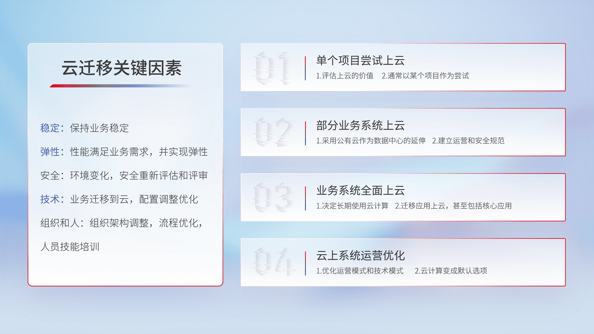 结合实际业务,,,从规划设计、、云平台选型、、云原生改造、、、数据迁移、、、、集成交付,,迁移全过程为客户识别最佳上云路径,,,做好风险识别管理,,,,设计网络架构、、、、身份权限、、、、安全审计合规、、、操作审计、、、、日志审计、、监控告警策略、、、、多站点容灾设计等,,对云上基础设施进行整体规划,,,,提升IT治理水平,,,以满足弹性、、、高可用、、、高性能的需求。。