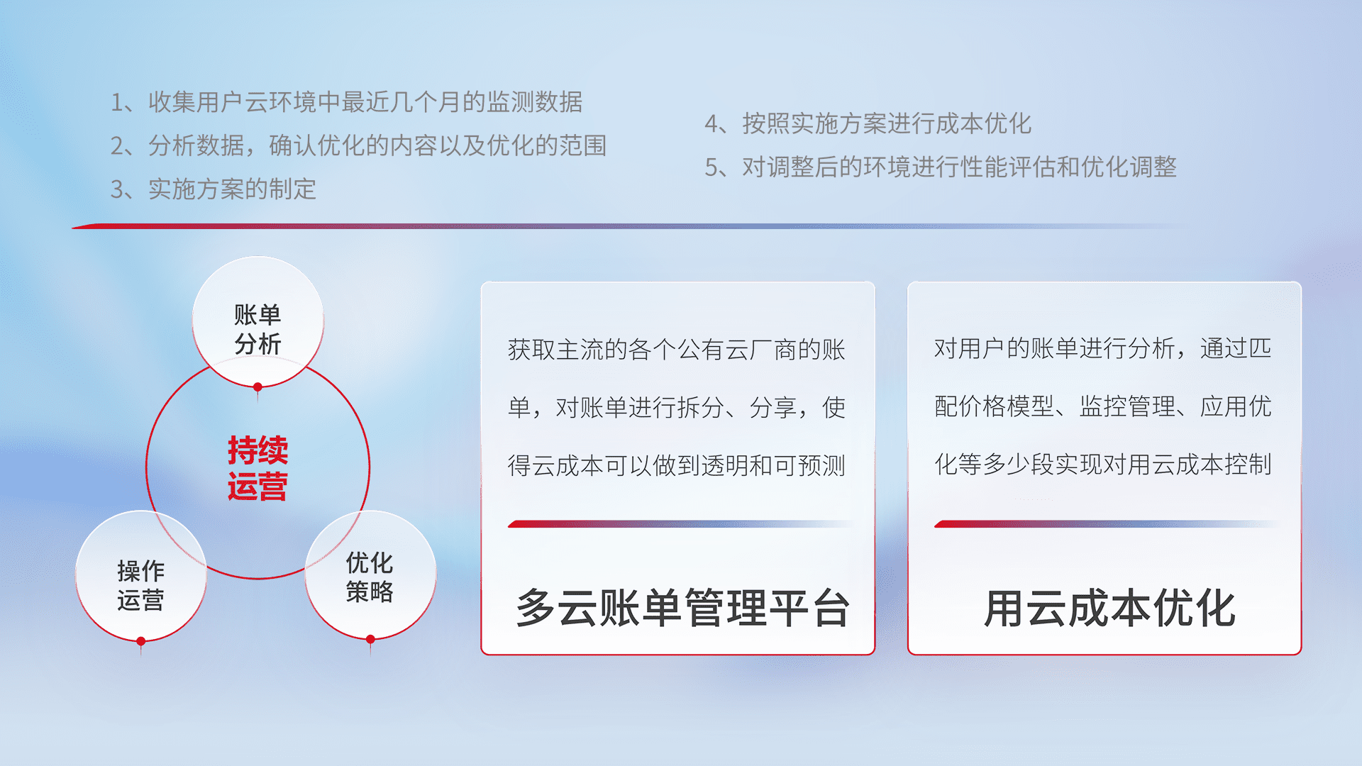 通过多云纳管,,,,以统一的资源数据模型把客户的云资源进行抽象和封装,,进而实现对多云资源的统一操作,,,保障云资源管理的可靠性、、稳定性与可用性。。。量身定制化运维内容,,配置、、、、开发运维、、补丁管理、、、、备份、、监控、、、认证和访问管理、、、审计和日常巡检等,,,,保障在用云过程中的可靠度,,,,稳定度以及高可用率。。。。
