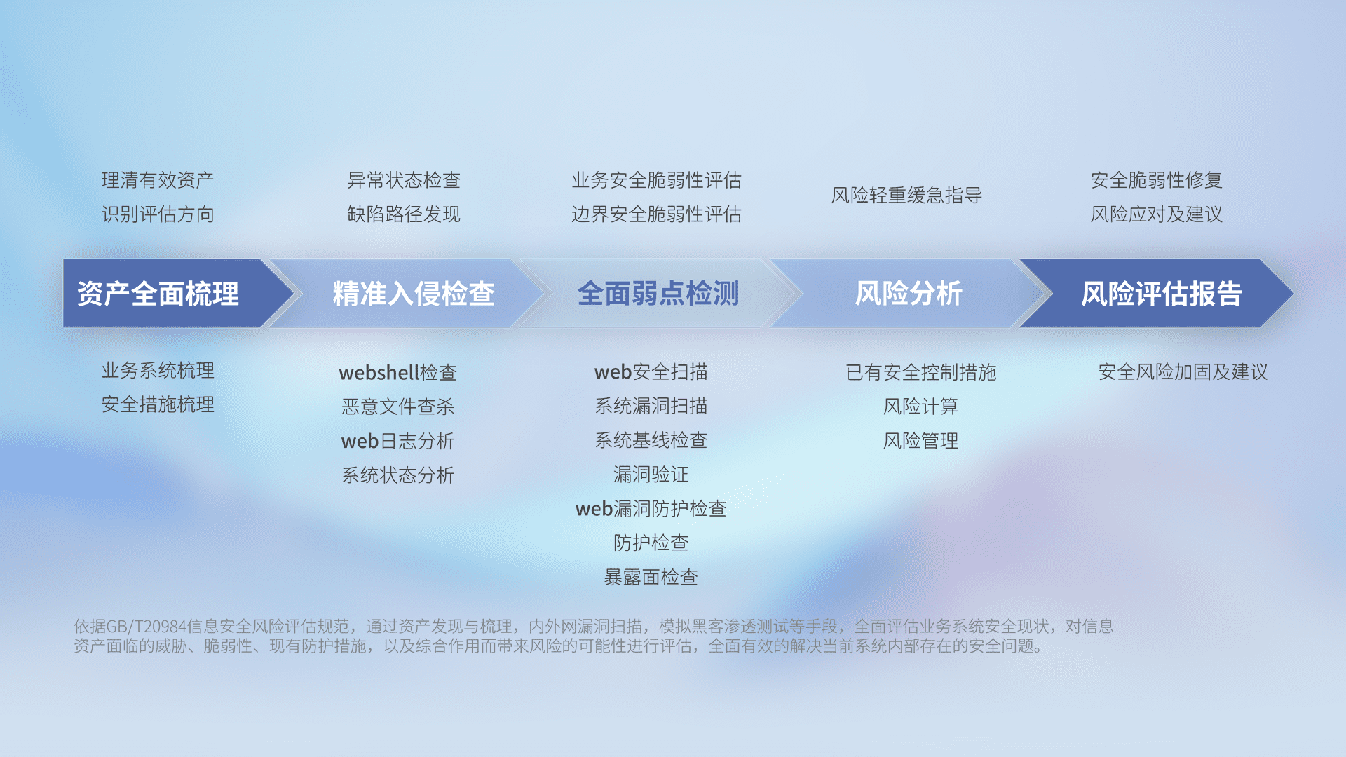 针对客户行业特性,,,,以专业的安全服务+多厂商联合解决方案提供专属的一站式安全管理服务,,,,帮助客户全面感知网络空间威胁,,基于识别、、检测、、、分析、、防护、、监测、、、、响应的服务理论模型,,,,从方案咨询、、集成交付、、评估验证、、优化加固、、、运维运营,,,致力于为客户提供完整的闭环管理式安全服务。。。。以实战经验为客户打造高抵御风险的安全体系,,,帮助客户发现威胁、、、、对抗威胁、、、、处置威胁,,,,不断积累安全对抗能力,,,持续保障数字化安全。。。。